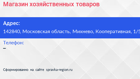 Магазин хозяйственных товаров по адресу 142840, Московская область, Михнево, Кооперативная, 1/5 в дальнейшем Организация, размещена в следующих категориях: