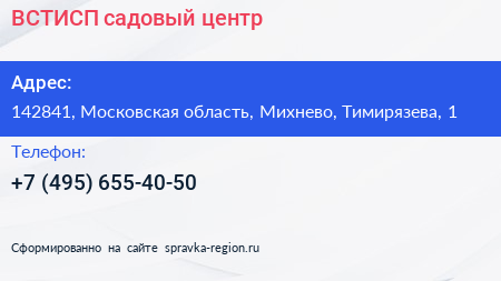ВСТИСП, садовый центр по адресу 142841, Московская область, Михнево, Тимирязева, 1 в дальнейшем Организация, размещена в следующих категориях: