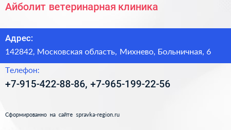 Айболит, ветеринарная клиника по адресу 142842, Московская область, Михнево, Больничная, 6 в дальнейшем Организация, размещена в следующих категориях: