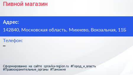 Пивной магазин по адресу 142840, Московская область, Михнево, Вокзальная, 11Б в дальнейшем Организация, размещена в следующих категориях: