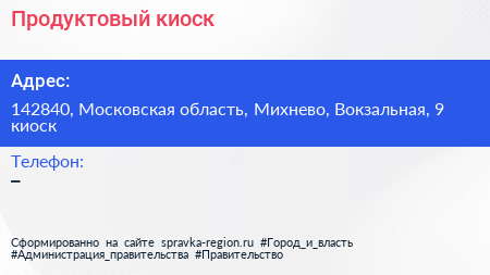 Продуктовый киоск по адресу 142840, Московская область, Михнево, Вокзальная, 9 киоск в дальнейшем Организация, размещена в следующих категориях: