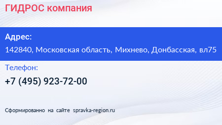 ГИДРОС, компания по адресу 142840, Московская область, Михнево, Донбасская, вл75 в дальнейшем Организация, размещена в следующих категориях:
