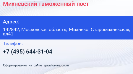 Михневский таможенный пост по адресу 142842, Московская область, Михнево, Старомихневская, вл41 в дальнейшем Организация, размещена в следующих категориях: