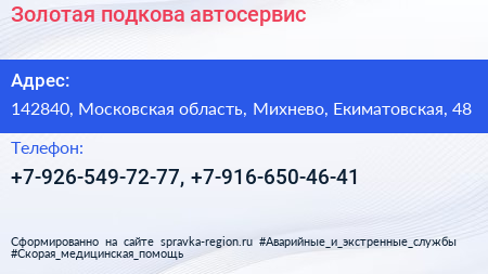 Золотая подкова, автосервис по адресу 142840, Московская область, Михнево, Екиматовская, 48 в дальнейшем Организация, размещена в следующих категориях: