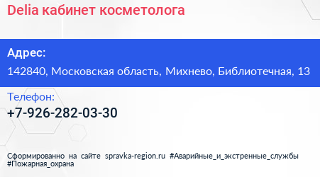 Delia, кабинет косметолога по адресу 142840, Московская область, Михнево, Библиотечная, 13 в дальнейшем Организация, размещена в следующих категориях: