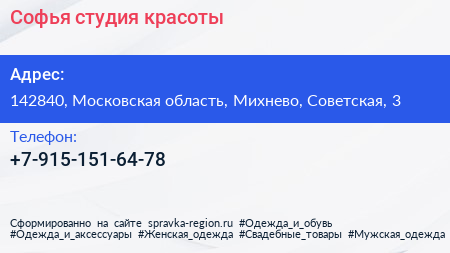 Софья, студия красоты по адресу 142840, Московская область, Михнево, Советская, 3 в дальнейшем Организация, размещена в следующих категориях: