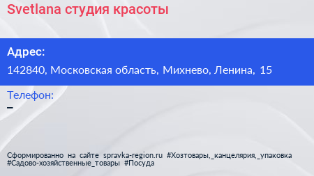 Svetlana, студия красоты по адресу 142840, Московская область, Михнево, Ленина, 15 в дальнейшем Организация, размещена в следующих категориях: