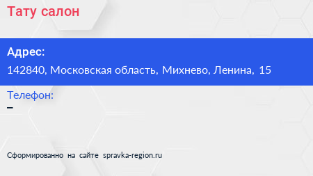 Тату-салон по адресу 142840, Московская область, Михнево, Ленина, 15 в дальнейшем Организация, размещена в следующих категориях: