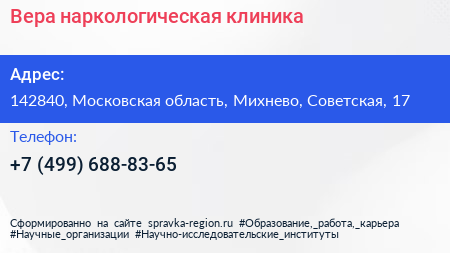 Вера, наркологическая клиника по адресу 142840, Московская область, Михнево, Советская, 17 в дальнейшем Организация, размещена в следующих категориях: