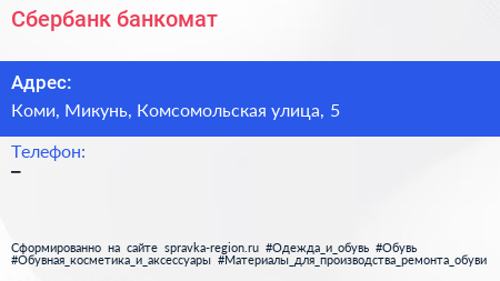 Сбербанк, банкомат по адресу Коми, Микунь, Комсомольская улица, 5 в дальнейшем Организация, размещена в следующих категориях: