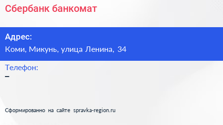 Сбербанк, банкомат по адресу Коми, Микунь, улица Ленина, 34 в дальнейшем Организация, размещена в следующих категориях: