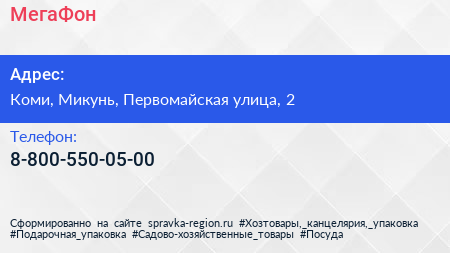 МегаФон по адресу Коми, Микунь, Первомайская улица, 2 в дальнейшем Организация, размещена в следующих категориях: