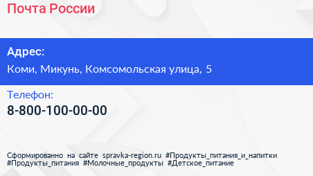 Почта России по адресу Коми, Микунь, Комсомольская улица, 5 в дальнейшем Организация, размещена в следующих категориях: