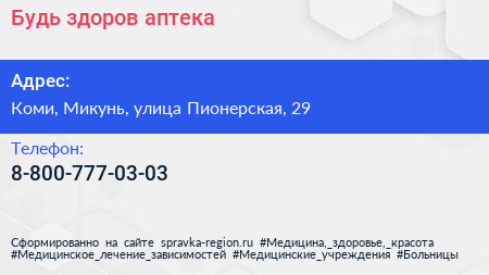 Будь здоров, аптека по адресу Коми, Микунь, улица Пионерская, 29 в дальнейшем Организация, размещена в следующих категориях: