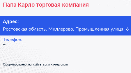 Папа Карло, торговая компания по адресу Ростовская область, Миллерово, Промышленная улица, 6 в дальнейшем Организация, размещена в следующих категориях: