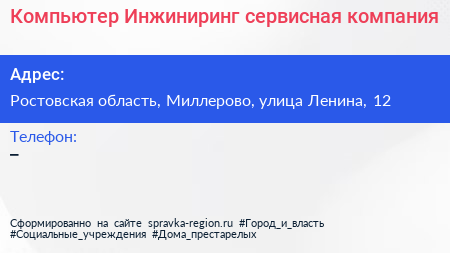 Компьютер Инжиниринг, сервисная компания по адресу Ростовская область, Миллерово, улица Ленина, 12 в дальнейшем Организация, размещена в следующих категориях: