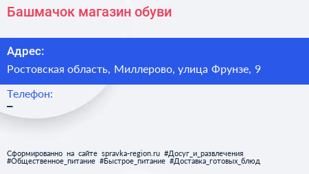 Башмачок, магазин обуви по адресу Ростовская область, Миллерово, улица Фрунзе, 9 в дальнейшем Организация, размещена в следующих категориях: