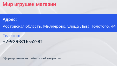 Мир игрушек, магазин по адресу Ростовская область, Миллерово, улица Льва Толстого, 44 в дальнейшем Организация, размещена в следующих категориях:
