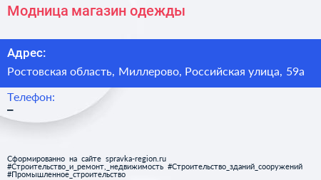 Модница, магазин одежды по адресу Ростовская область, Миллерово, Российская улица, 59а в дальнейшем Организация, размещена в следующих категориях:
