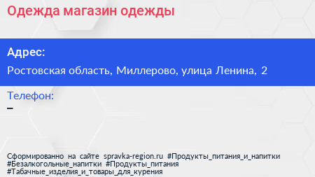Одежда, магазин одежды по адресу Ростовская область, Миллерово, улица Ленина, 2 в дальнейшем Организация, размещена в следующих категориях: