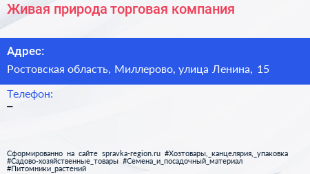 Живая природа, торговая компания по адресу Ростовская область, Миллерово, улица Ленина, 15 в дальнейшем Организация, размещена в следующих категориях: