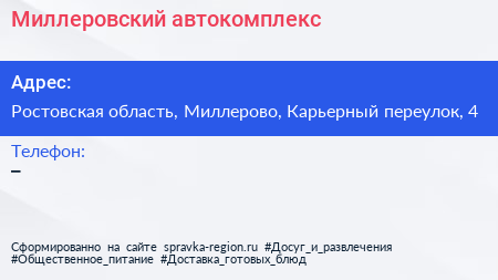 Миллеровский автокомплекс по адресу Ростовская область, Миллерово, Карьерный переулок, 4 в дальнейшем Организация, размещена в следующих категориях: