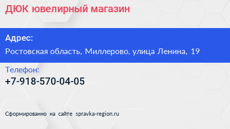 ДЮК, ювелирный магазин по адресу Ростовская область, Миллерово, улица Ленина, 19 в дальнейшем Организация, размещена в следующих категориях: