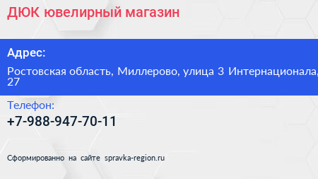 ДЮК, ювелирный магазин по адресу Ростовская область, Миллерово, улица 3 Интернационала, 27 в дальнейшем Организация, размещена в следующих категориях: