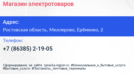Магазин электротоваров по адресу Ростовская область, Миллерово, Ерёменко, 2 в дальнейшем Организация, размещена в следующих категориях: