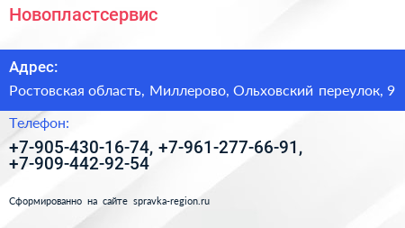 Новопластсервис по адресу Ростовская область, Миллерово, Ольховский переулок, 9 в дальнейшем Организация, размещена в следующих категориях: