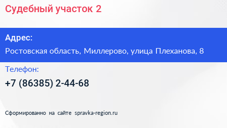 Судебный участок №2 по адресу Ростовская область, Миллерово, улица Плеханова, 8 в дальнейшем Организация, размещена в следующих категориях: