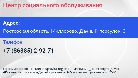 Центр социального обслуживания по адресу Ростовская область, Миллерово, Дачный переулок, 3 в дальнейшем Организация, размещена в следующих категориях: