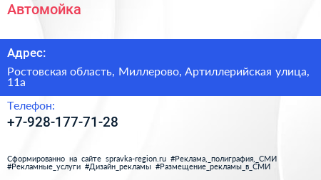 Автомойка по адресу Ростовская область, Миллерово, Артиллерийская улица, 11а в дальнейшем Организация, размещена в следующих категориях: