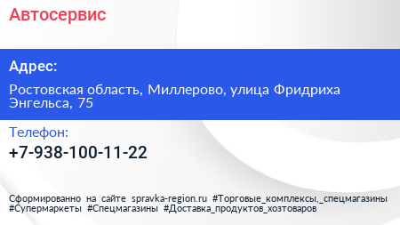 Автосервис по адресу Ростовская область, Миллерово, улица Фридриха Энгельса, 75 в дальнейшем Организация, размещена в следующих категориях: