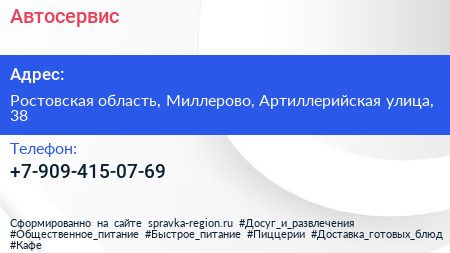 Автосервис по адресу Ростовская область, Миллерово, Артиллерийская улица, 38 в дальнейшем Организация, размещена в следующих категориях: