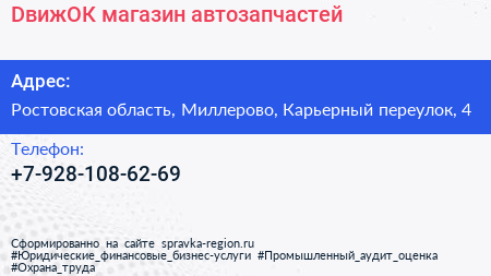 DвижОК, магазин автозапчастей по адресу Ростовская область, Миллерово, Карьерный переулок, 4 в дальнейшем Организация, размещена в следующих категориях: