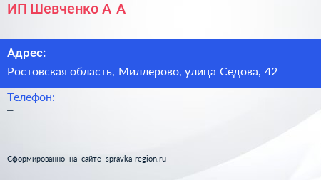 ИП Шевченко А.А. по адресу Ростовская область, Миллерово, улица Седова, 42 в дальнейшем Организация, размещена в следующих категориях: