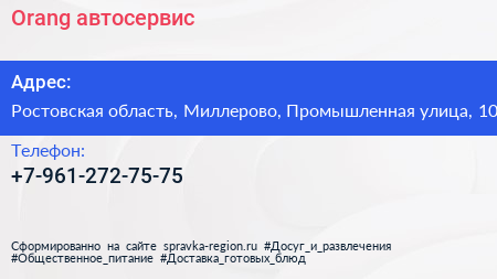 Orang, автосервис по адресу Ростовская область, Миллерово, Промышленная улица, 10 в дальнейшем Организация, размещена в следующих категориях: