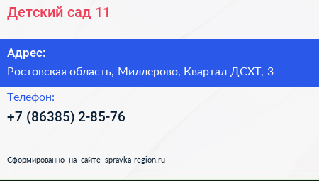 Детский сад №11 по адресу Ростовская область, Миллерово, Квартал ДСХТ, 3 в дальнейшем Организация, размещена в следующих категориях: