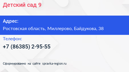 Детский сад №9 по адресу Ростовская область, Миллерово, Байдукова, 38 в дальнейшем Организация, размещена в следующих категориях: