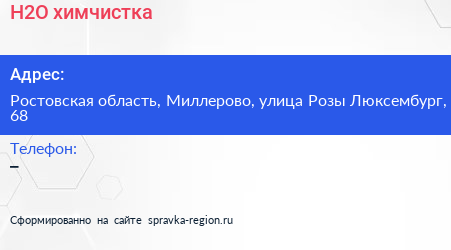 H2O, химчистка по адресу Ростовская область, Миллерово, улица Розы Люксембург, 68 в дальнейшем Организация, размещена в следующих категориях: