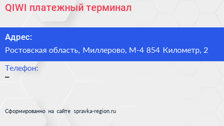 QIWI, платежный терминал по адресу Ростовская область, Миллерово, М-4 854 Километр, 2 в дальнейшем Организация, размещена в следующих категориях: