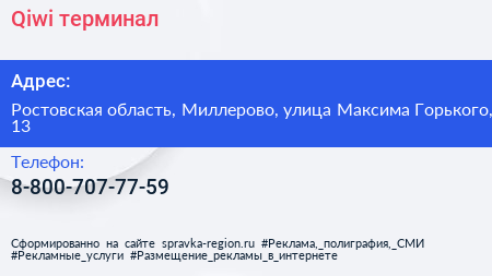 Qiwi, терминал по адресу Ростовская область, Миллерово, улица Максима Горького, 13 в дальнейшем Организация, размещена в следующих категориях: