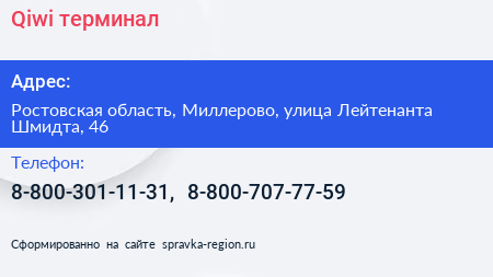 Qiwi, терминал по адресу Ростовская область, Миллерово, улица Лейтенанта Шмидта, 46 в дальнейшем Организация, размещена в следующих категориях: