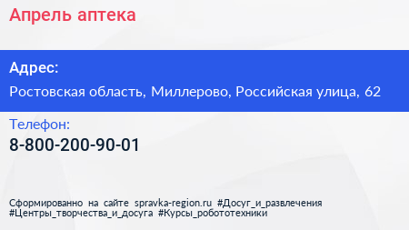 Апрель, аптека по адресу Ростовская область, Миллерово, Российская улица, 62 в дальнейшем Организация, размещена в следующих категориях: