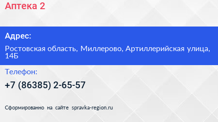 Аптека №2 по адресу Ростовская область, Миллерово, Артиллерийская улица, 14Б в дальнейшем Организация, размещена в следующих категориях: