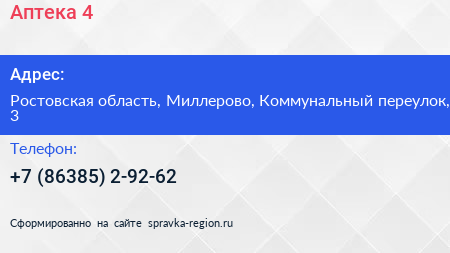 Аптека №4 по адресу Ростовская область, Миллерово, Коммунальный переулок, 3 в дальнейшем Организация, размещена в следующих категориях: