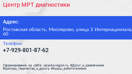 Центр МРТ-диагностики по адресу Ростовская область, Миллерово, улица 3 Интернационала, 60 в дальнейшем Организация, размещена в следующих категориях: