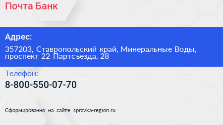 Почта Банк по адресу 357203, Ставропольский край, Минеральные Воды, проспект 22 Партсъезда, 28 в дальнейшем Организация, размещена в следующих категориях: