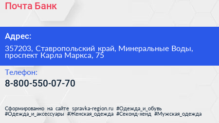 Почта Банк по адресу 357203, Ставропольский край, Минеральные Воды, проспект Карла Маркса, 75 в дальнейшем Организация, размещена в следующих категориях: